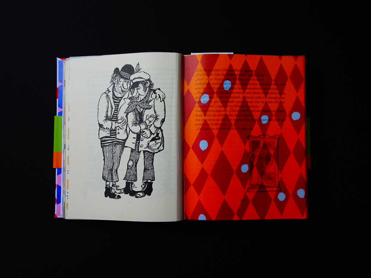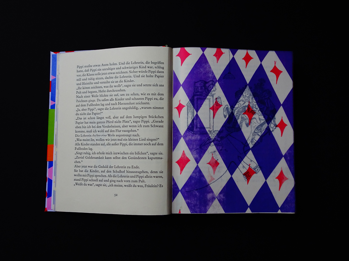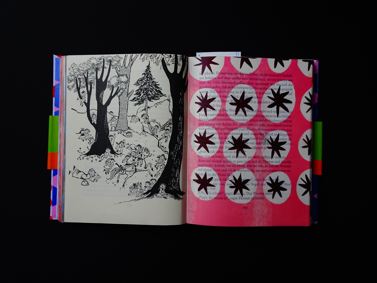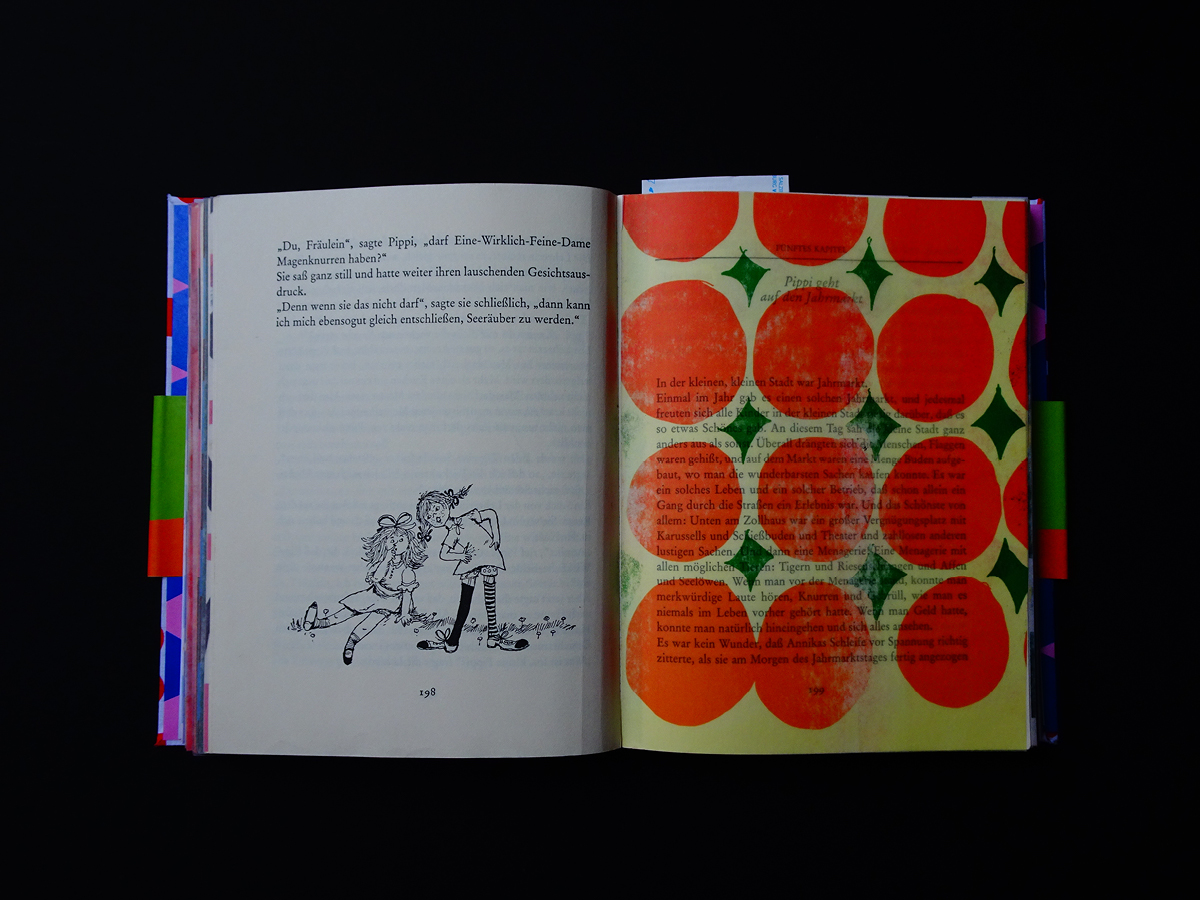 Pippi Langstrumpf is a project that started after I found the inside pages of the book in a book-phone-box. I felt so sorry for the poor box so I decided to give it a makeover – By adding 40 different hand drawn colourful patterns to the inside, giving it a cover and a sleeve.
