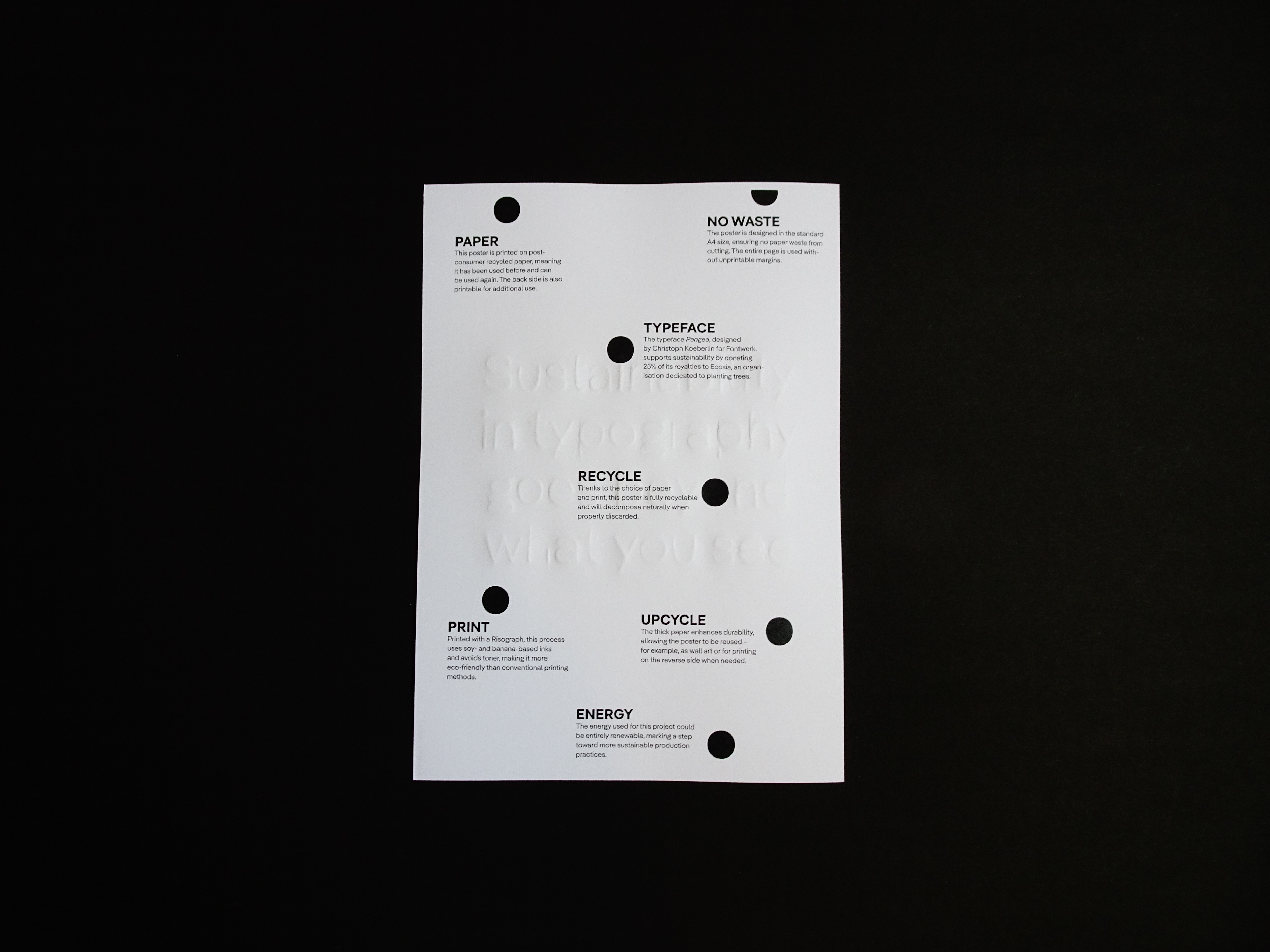 Sustainability in Design, mostly Fashion Design and also Product Design in general is really up to date. But what about sustainability in typography? What is it? Does it even exist? This project is a series of 5 posters, aiming to raise awareness on the topic and show, that we still have a long way to go to make this area in design more sustainable. The brilliant typeface used for the following posters is Pangea, designed by Christoph Koeberlin.